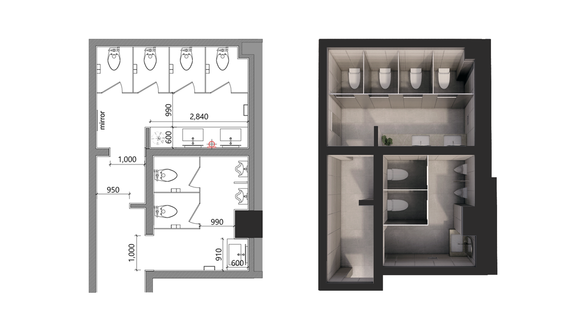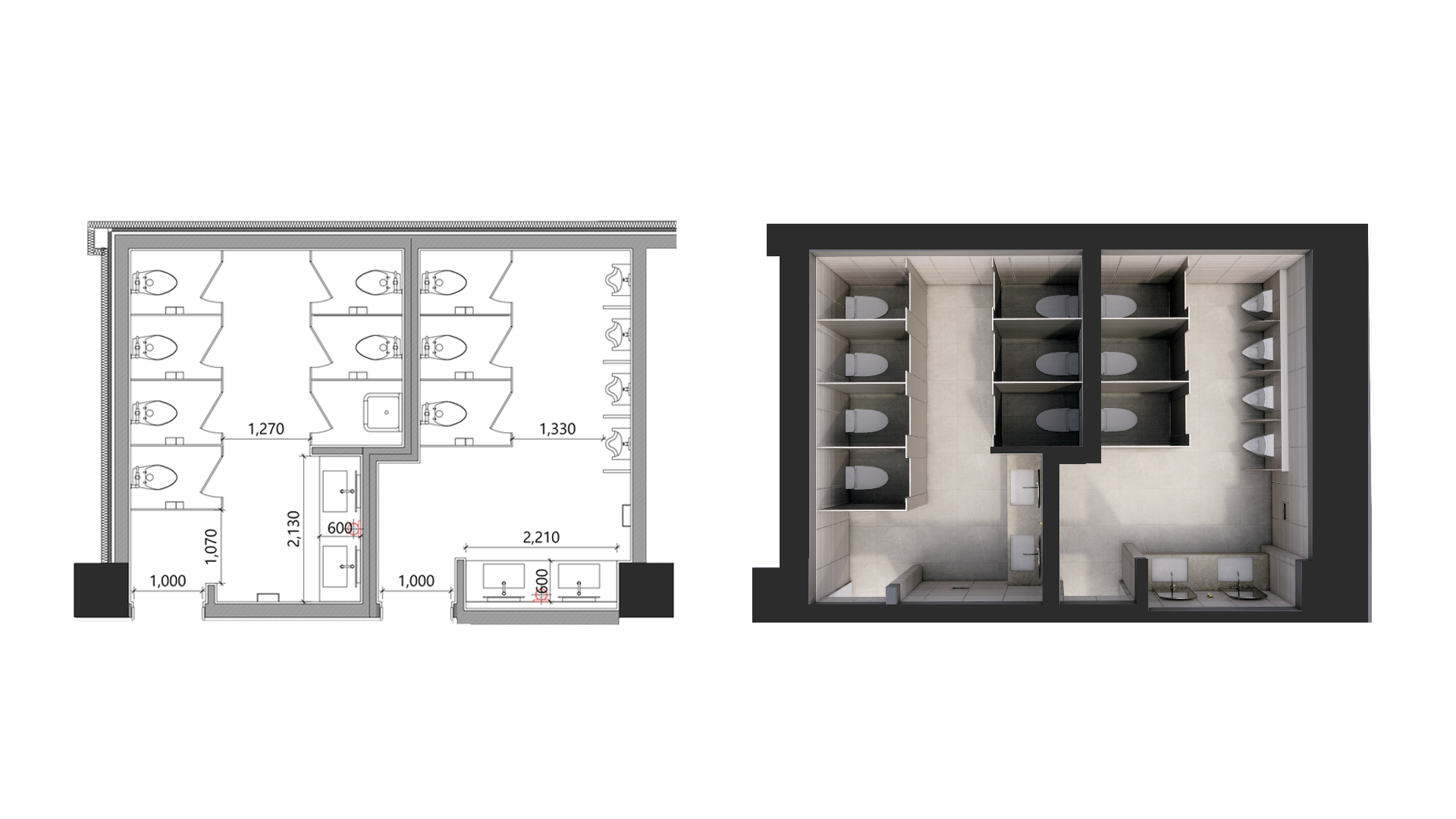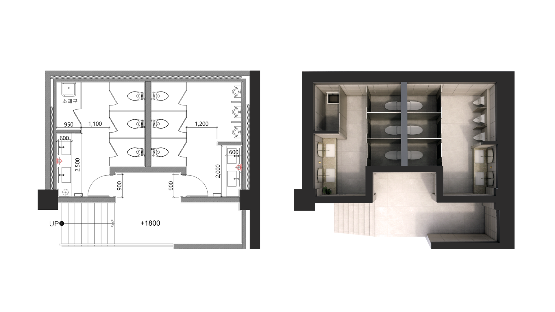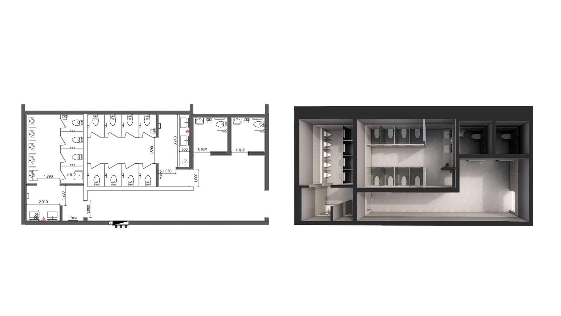 소변기 — 변기칸 — 세면대가 짧은 동선 안에 위치하여 회전율이 빠른 소규모 화장실에 적합.