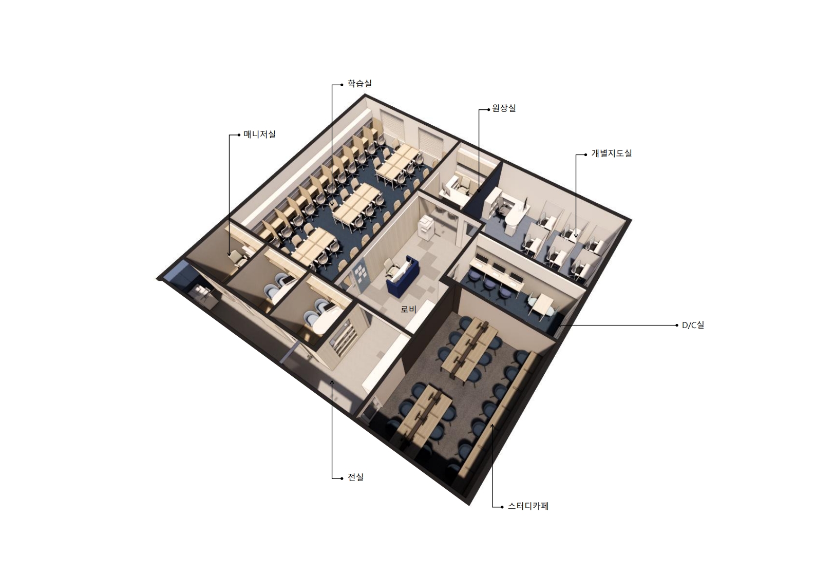 원장실 1개(최소사이즈 2100*2400), 개별지도실 1개(좌석 9~21개),