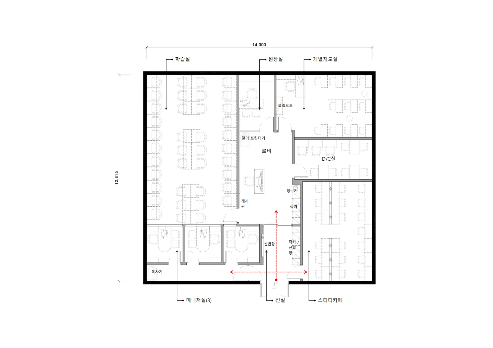 →매니저실 옆이 학습실이 되도록 공간 구획