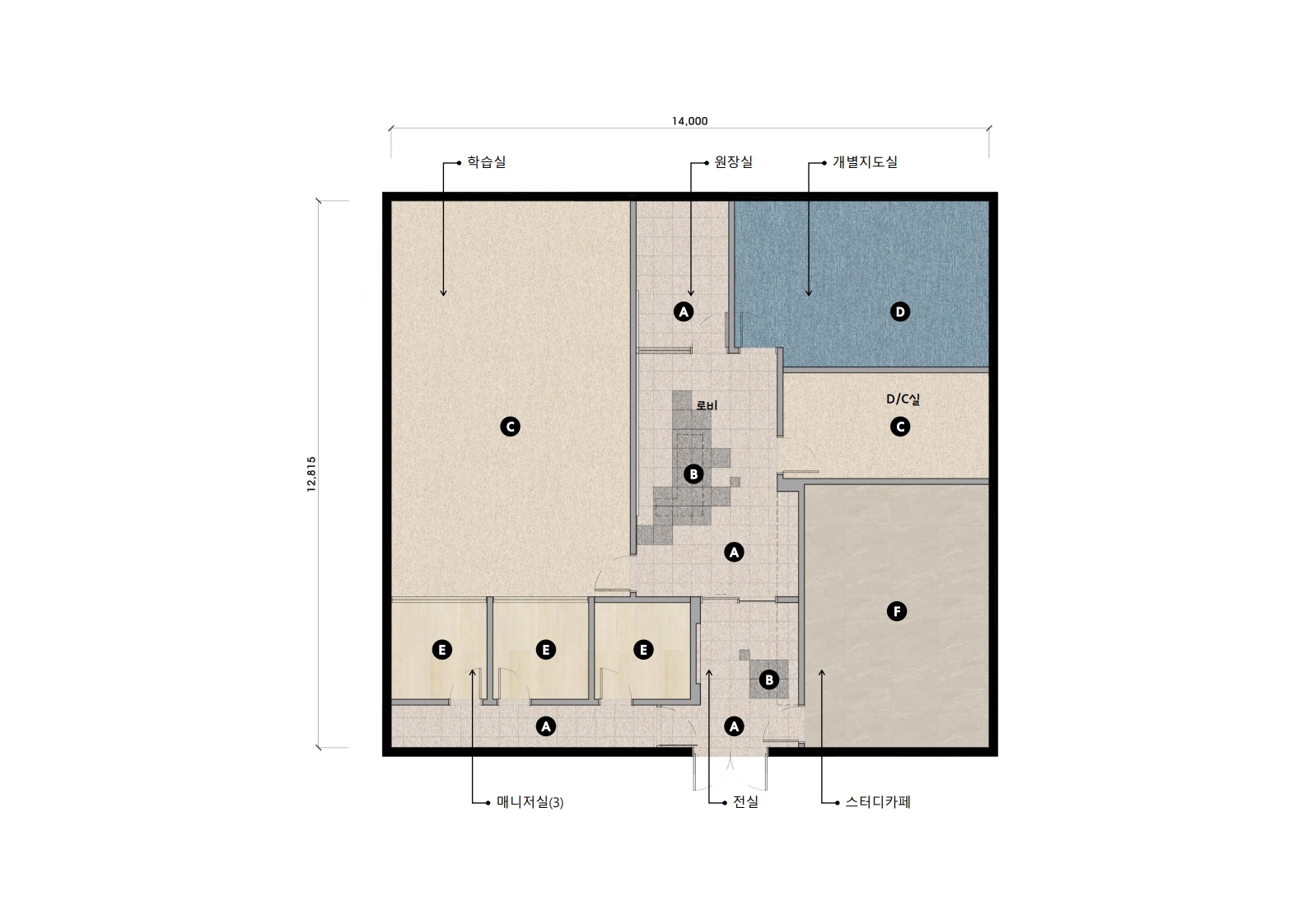 →원장실, 교사실, 화장실, 수업을 하지 않는 공간, 탕비실, 창고, 복도, 기둥,