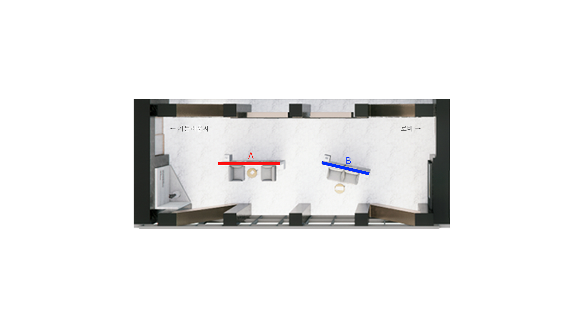 공간의 흐름이 분산되지 않도록 시각적 기준선을 형성하며, 라운지로 이어지는 이동 동선을 명확히 구분합니다.